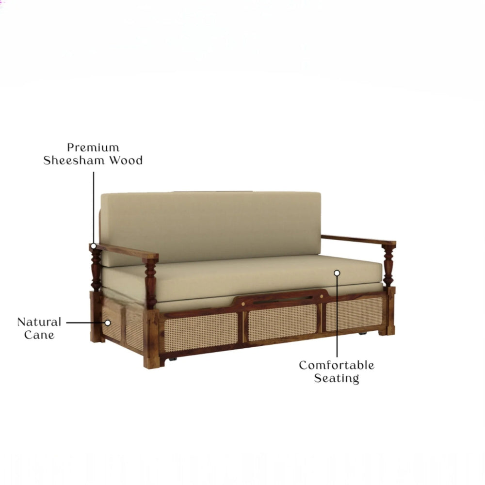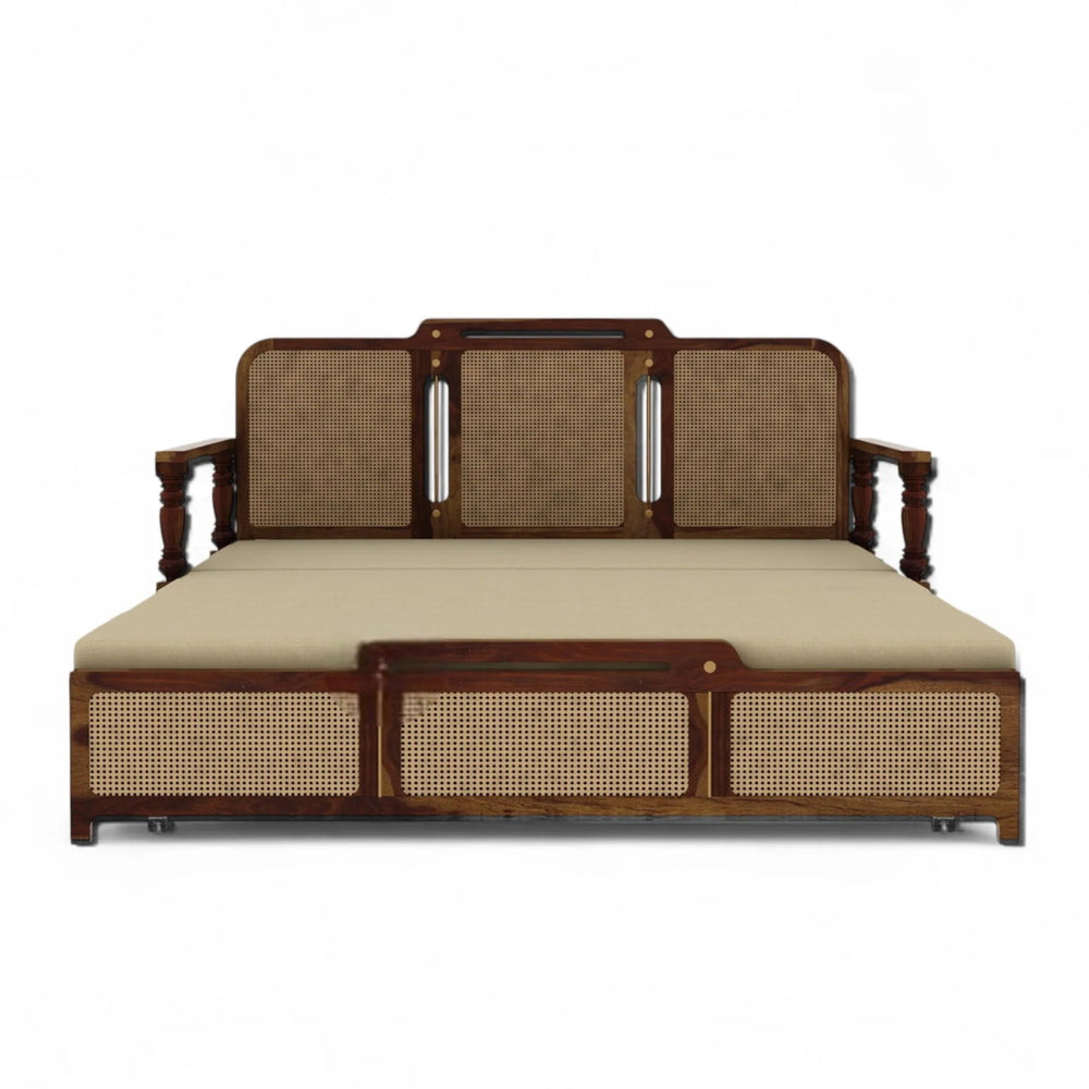 The Sheesham Wood 3-Seater Sofa Cum Bed blends timeless craftsmanship with everyday comfort. Crafted from durable sheesham wood, it features beautifully handwoven cane detailing and plush premium upholstery. Designed for versatility, it functions as an elegant sofa by day and effortlessly transforms into a cosy bed whenever needed.